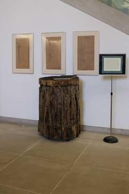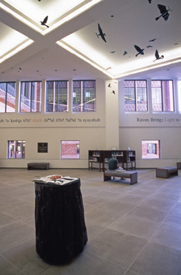Carl Chew collaborated with artists Mare Blocker, Ron Hilbert Coy and J.T. Stewart to create "Raven Brings Light to this House of Stories", a six-element artwork installed throughout the Allen Library. It is a contemporary re-telling of a Pacific Northwest Native American story. Each element of the artwork explores themes and symbols relating to collective knowledge. Salish carver Ron Hilbert Coy created Table of Knowledge to portray and celebrate the passage of knowledge from one generation to the next. An artist's book 'Presentations for the International Symposium of Light Sculpture' printed by Mare Blocker is placed on top of the table.