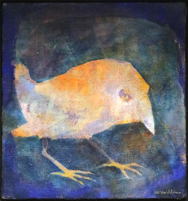 Small Bird is a painting by artist Mel McCuddin, composed using a warm, subtle under-painting to make the colors of the image glow. This piece is part of the artist's body of work in which the composition of a solitary figure develops spontaneously. McCuddin notes, "the complete painting seems to project a sense of wonder and apprehension at the complexity of life into which this bird was thrust when it struggled out of the egg."