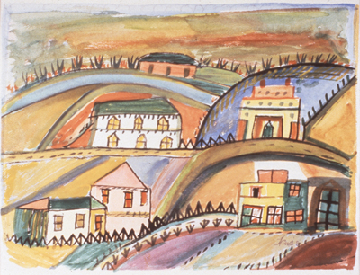 The vibrant painting Country Homes is part of artist Ruza Erceg's body of work that imaginatively depicts rural scenes from her hometown in Croatia (formerly Yugoslavia) in Europe. It playfully explores perspective and an abstracted use of color and form.