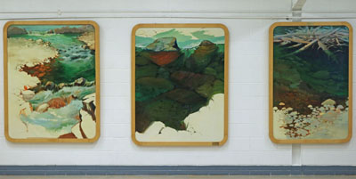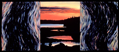 Currents is a triptych painting created by artist Stephen Yates. He based the center panel on the landscape near his home on Marrowstone Island, near Port Townsend, Washington. The view looks across a salt marsh at sunset, with the Olympic Mountains in the background. He notes, "The evening light reflecting across the water creates the quiet abstracted patterns in the center panel. They are bordered on each side by twisting, flowing marks suggesting the ebb and flow of tidal currents that move water in and out of the marsh, the bay and Puget Sound. The title Currents refers to these physical forces of nature and also suggests the currents of thoughts and beliefs that carry us through life and shape and change the ways we perceive life."