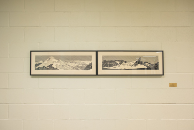 North Cascades features two panels of a panoramic view of the Glacier Peak Wilderness area. The landscapes show the south side of Glacier Peak and an eastern view of the Suiattle Glacier. Both are located in the North Cascades mountain range that extends from Washington State into British Columbia, Canada. Artist Patrick Anderson created the imagery on location after hiking into the wilderness. He cut shapes from stencil film so he could create the composition in any type of weather. Anderson states that his imagery references geological maps. He notes that these prints "attempt to map what I felt as I looked at my environment, how that environment makes me feel."