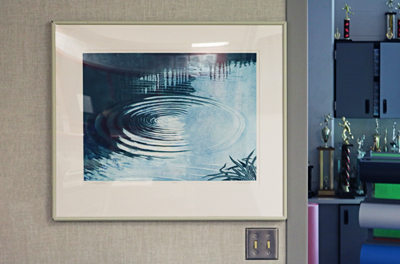 Artist Sherrie Wolf created the print Pond using the "spit-bite" etching technique. In this printmaking method, she painted nitric acid onto a printing plate to create controlled etching. The etched areas are then loaded with ink, which transfers to paper when printed. She used many different plates to create the colorful imagery. She notes, "My intention in this etching Pond is to convey a remembered experience of how water responds to an interruption, and its highly reflective atmospheric effects. The infinite abstract forms found in water suggest and inspire other interpretations."