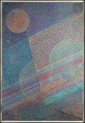 Space Planes is an energetic abstract drawing by artist Ed Praczukowski. It is part of his investigation into space and the universe. He composed this piece by layering short strokes of pastel in many colors to make different geometric forms. He calls this style "cosmic impressionism." He notes, "All things are made up of particles of energy that are hyper active in a flux state and not as solid and passive as they appear."