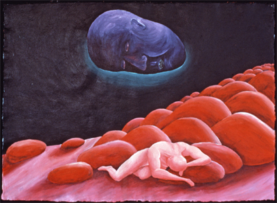 Weight is a surreal, dream-like painting by artist Andrew Keating. He invites the viewer to form their own thoughts and impressions of this piece. He encourages you to question the relationship between the reclining figure and the floating head. Is the figure sleeping or weeping? Whom does the floating head represent? Keating notes, "I believe visual art should seek, allow and encourage poetic interpretation. There is no correct interpretation."