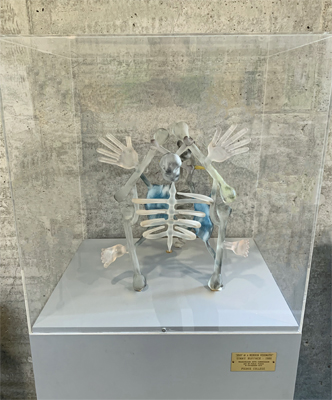 Artist Ginny Ruffner created Xray of a Bedouin Vegomatic after she had a vivid dream. The dream was set in a Bedouin nomadic encampment on the Jordan River in the Middle East. The sculpture references a device in Ruffner's dream, that was used in their kitchens to mix cornmeal. Ruffner created the whimsical sculpture using a lampworking technique. The glass pieces were heated over a torch, and then bent and shaped using tools and gravity. She painted the glass sculpture, blasting away some of the paint so that it looks like a translucent x-ray.