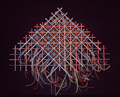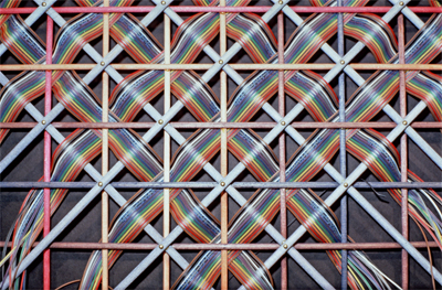 Ocotilla Fiesta is part of a series of woven wall sculptures created by artist Katherine Holzknecht using found objects and interwoven wires. Intrigued by the structural possibilities of cast-off computer parts, the artist notes how the multicolored wires that comprise this piece reminded her of ocotillos, a type of cactus common in the Arizona desert where she spent her childhood.