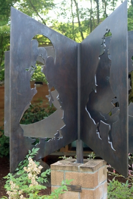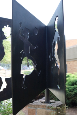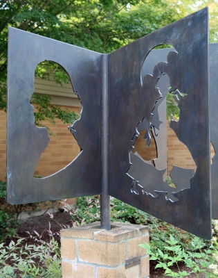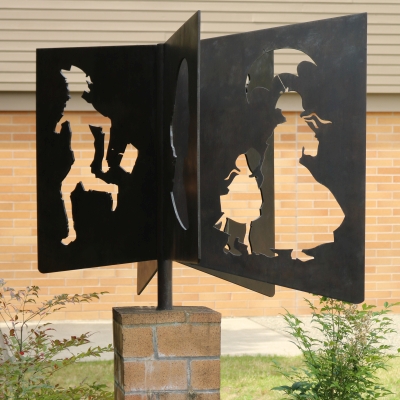 Artist Larry Anderson created the bronze sculpture Alcott for Louisa May Alcott Elementary in Redmond, Northwestern Washington. Shaped like a book, the sculpture is made up of five "pages" with cut-out silhouettes of different people. The author Louisa May Alcott, known for her classic novel "Little Women", inspired the sculpture.
