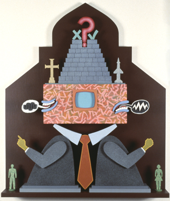 The Politician is a surreal painted collage created by artist Bill Whipple. The composition features two figures joined together by a single collar and tie. A TV and pyramid replace the head of the figures, surrounded by symbols. He notes, "The Politician is about the tendency of those in public office, or running for public office, to address a number of issues, and to try to accommodate opposing views on those issues. The result can be insincerity and uncertainty."