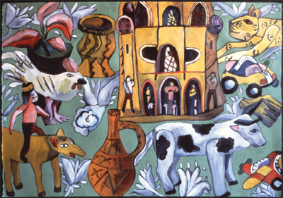 Artist Melvinita Hooper created the detailed and colorful painting Cow with a Peruvian Church. The artist notes, "This painting expresses my interest in folk art, particularly in Mexican, Central and South American… I also love animals, color, patterns and flowers."