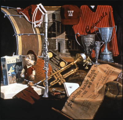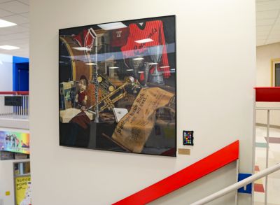 ‘Experience the World Through Your Senses’ is a series of 18 hand-painted photographs by artist Connie Ritchie. The series celebrates how our five senses (sight, smell, sound, taste, and touch) unify us all and connect our experiences to our memories, imagination, sense of place, and community. 'Memory' is a still-life scene composed of objects and elements that are significant to the history of Washington Middle School. This artwork is a visual representation of memory and imagination.