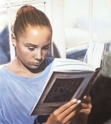 ‘Experience the World Through Your Senses’ is a series of 18 hand-painted photographs by artist Connie Ritchie. The series celebrates how our five senses (sight, smell, sound, taste, and touch) unify us all and connect our experiences to our memories, imagination, sense of place, and community. 'Reading' depicts how we can be engrossed in a story. It hints at the interplay between the words we see on the page and the world we imagine in our mind. This artwork is installed beside four other photographs representing the sensation of sight.