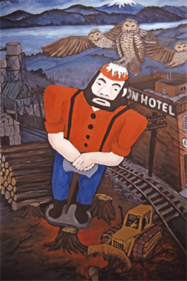 PB and the Spotted Owls is part of artist Michael Lindenmeyer's series of paintings about Paul Bunyan. These imaginative artworks place the giant lumberjack in different contexts and environments. This piece asks the viewer to think about the logging industry and our relationship to the land in the Pacific Northwest. The loss of our old-growth forests due to logging threatens Spotted Owl populations in Washington.