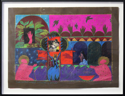 Artist Janet Taylor Pickett explores her personal history and ancestry in I was Birthed Amongst A Richness of Forever. The artwork is composed of vivid images, as well as mythical symbols and art historical references. Painting, drawing, collaged elements, and found objects such as upholstery tacks and tin can tops are all used. This artwork is part of a series of ten mixed-media artworks created by Janet Taylor Pickett for the collection "Who We Are: Autobiographies in Art." The series was commissioned by the Washington State Arts Commission in partnership with the Office of the Superintendent of Public Instruction in 1990.