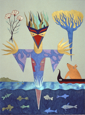 Artist Mauricio Robalino based his fantastical painting 'Visiting Friends at Sea' on two important moments in his life. He states, “The first took place when I was seven or eight years old. A photograph was taken of me bringing a bouquet to my mother. I do not know where the photograph is now but the image will forever live in my memory and be celebrated in my Art. The other event celebrated in this picture is the time I spent in Cuyabeno National Park in the Amazon rain forest of Ecuador. During the winter season, the rainfall is such that vast areas flood and become great and beautiful lakes. The only way to get around is by dugout canoe powered by paddles and small gasoline engine. It is a wonderful and peaceful place filled with birds, monkeys, fish, snakes, caimans, felines, sloths, etc., etc., etc. “