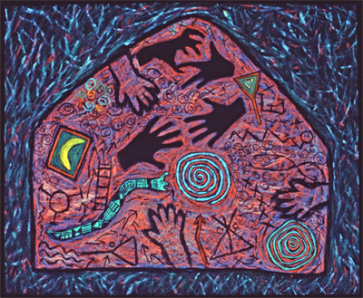 Artist Ruza Erceg created the vibrant painting Sunset. It is one of nearly 300 paintings that imaginatively recall her memories of life in Croatia (formerly Yugoslavia) in Europe. She based most of these paintings on her birthplace, the small village of Kamenmost.