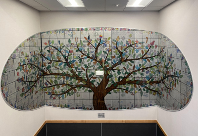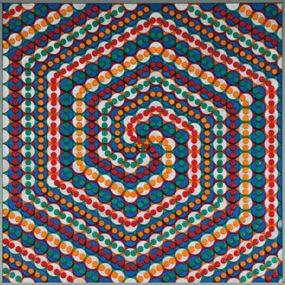 Artist Richard "Dick" C. Elliott created Spiral by combining industrial highway reflectors into an expressive geometric motif that dynamically changes with differing light. Of his work, Elliott notes "The more that I have explored geometric patterning, the more I have become convinced that there is a universal visual language that transcends both time and place."