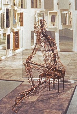 Man From The Installation "Personal Space" is a metal wire sculpture created by artist Carolyn King. The form evolved over several years. The artist first constructed the basis of the sculpture from metal found in a furnace on the Marylhurst College campus. She then built a wire shell around the central structure, which she let patina with age and rust outside for a long time. She finally applied a copper overlay.