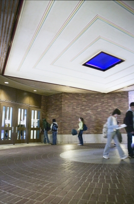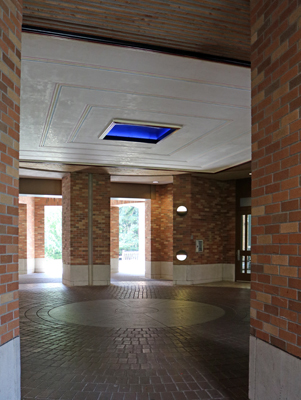 Artist Jackie Winsor created this refined and minimal rotunda ceiling installation. The piece features a square spiral maze delineated by subtle color-bands, and a blue central dome that evokes the sky at twilight. This piece explores the relationship and interaction of different surfaces and patterns, and was hand crafted to emphasize process and labor.