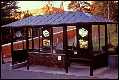 Untitled by artist Ted Gibson is a set of two images that were temporarily installed in lightboxes at the bus stop outside of UW's Meany Hall. This artwork was part of a group of rotating installations on the University of Washington campus. The artists were selected in a competitive process to create images for existing lightboxes at bus stops outside of the UW's School of Art and Meany Hall. The images were reproduced as large-scale transparencies to fit the lightboxes. The bus stops featured the artworks for several months.