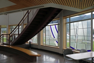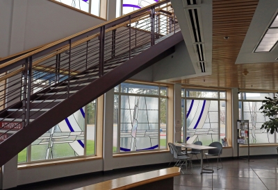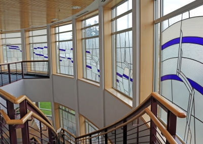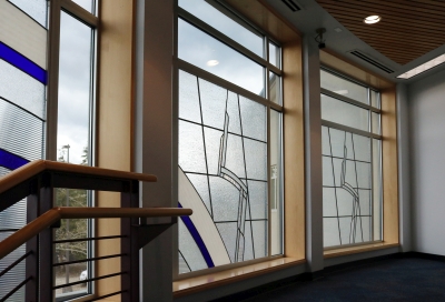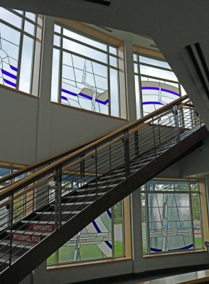 Quixote's Comet is a site-specific, stained-glass installation by artist Jack Archibald. The glass mural is comprised of fourteen windows that together form a monumental abstract composition. The quietly beautiful design emphasizes line, texture, and movement, and has a flow like calligraphy. Archibald wanted the glass installation to complement the architect's vision rather than compete with it. He also wanted it to be visible from the furthest points of the parking areas. He describes it as “a dynamic accent to an already dramatic entryway, and an artwork that is effective even when viewed in sections.” The installation also highlights the variability of light experienced when viewers pass through the space.