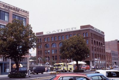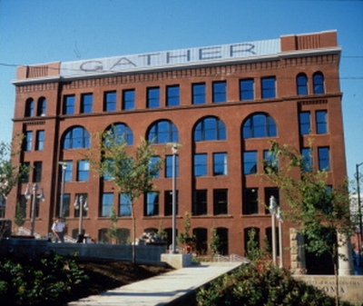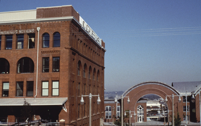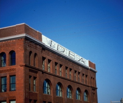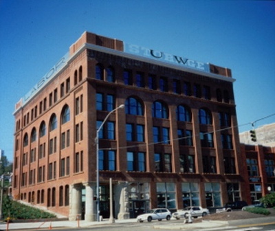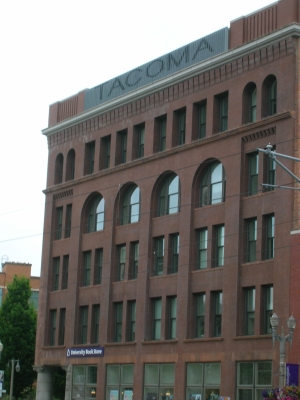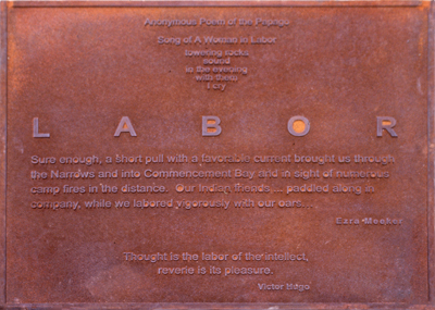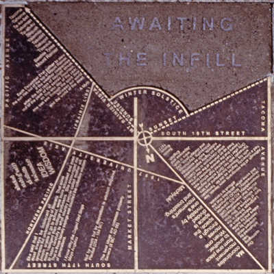 Buster Simpson created Parapet Relay to honor history and community -- the Garretson Woodruff-Pratt building’s history as a warehouse and the University of Washington Tacoma’s relationship with the neighborhood. The artwork is made of two text panels and three sidewalk viewing markers. Two, long panels of text along the building's roofline change when seen from different angles. Depending on where you are standing on the campus, the signs read as one of the following words: IDEA, WISDOM, GATHER, LABOR, STORAGE, UW, or TACOMA. Parapet Relay also includes three markers that are set into the concrete sidewalks of the surrounding area. They mark ideal viewing points that help you see a specific scene of the campus. This provides context and extra information for the text panels as you look at the Garretson Woodruff-Pratt building, the UW Tacoma campus, and the surrounding area.