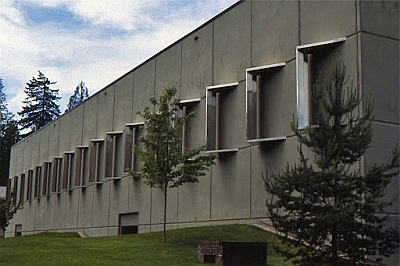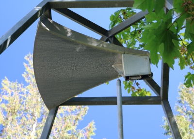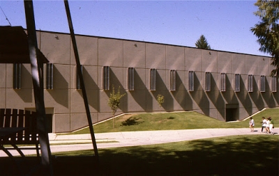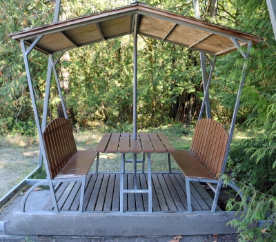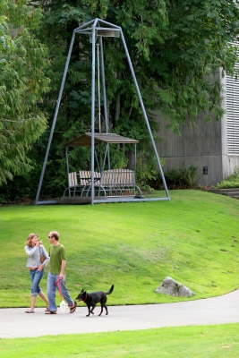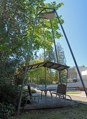 Panel Discussion with Slowswing is a conceptual and interactive sculpture created by artist Alan Storey. The sculpture is made up of two wooden benches that are suspended from a steel structure, plus seventeen aluminum panels installed on the side of a nearby building. The swing is started when people sit on its benches. Conversations on the swing are reflected back as echoes by the sound-amplifying device at the top of the swing and the shaped aluminum panels on the nearby building. Storey wanted the sculpture to be a gathering place for the community at The Evergreen State College.