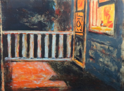 Inner Light is a monotype by artist Stephen Hayes, printed at North Light Editions in Portland, Oregon. He notes, "More and more my work seems to be a response to my immediate surroundings and how they serve as a metaphor for the things I think about. So this on one level is a picture of my front porch… On another level it is a work about revealing things, being on the inside and the outside of a person, etc." Monotypes are unique prints created by painting with inks directly onto the printing plate. Only one print can be made from the plate. The image is transferred onto paper using a printing press.