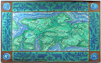 Island Dreams is part of textile artist Constance Parker Miller's body of hand-painted and stenciled floor cloths. This piece features the topography of Bainbridge Island, Washington, where the artist lives. With this work, Miller notes that she "wanted to show an island reality prior to the pioneers, roads and modern technology. I wanted to dream of a place I know well, and feel what it was like to walk on the ground, through the trees, to look out across the water, to encounter the animals and plants that once lived there."