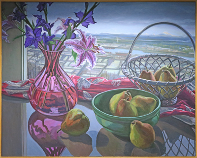 'Comice Pears & Mt. St. Helens' is a still-life painting by artist Shelley Jordon. It is part of a body of work that explores the changing Northwest landscape and the "power and beauty of domestic spaces and objects." Jordon's painted still life objects communicate through a window with typical urban or natural Northwest landscapes -- of forests, shipyards, mountains, and more. These background landscapes make the universal objects specific to the Northwest. Jordon paints in natural light, directly from life. She notes, "Light is the force which brings to life my otherwise still life objects. The same light that describes the form simultaneously destroys it, turning the still life objects into abstract shapes of color and pattern."