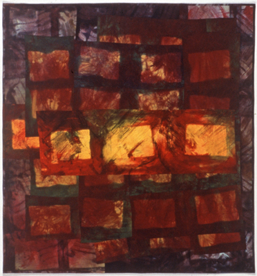 City of Windows is part of a series of quilts called "Windows and Storylines" by artist Jeannette Meyer. This series explores personal narratives and differing points of view. Meyer notes "windows, which both contain and frame stories, fascinate me." Created from hand-dyed fabrics, the textured and colorful surface was created by printing and re-dying blocks of fabrics. The storylines are represented by the quilted stitching, made from multicolored thread.