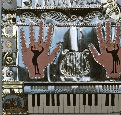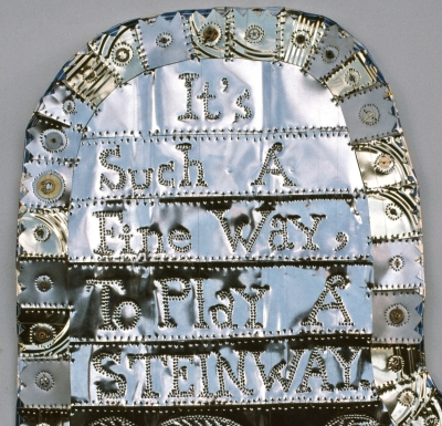 It's Such a Fine Way is a whimsical mixed media sculpture created by artist Ross Palmer Beecher, who often uses recycled and found objects in her artworks. The keys of the piano are made from an electrical control panel to an old stove. The text reads "It's such a fine way to play a Steinway," which references lyrics from a duet between Judy Garland and Fred Astaire in the film 'Easter Parade' (1948). Describing her inspiration for this piece, Beecher notes "the piano stirred my soul. Something deep down there. No words for it."