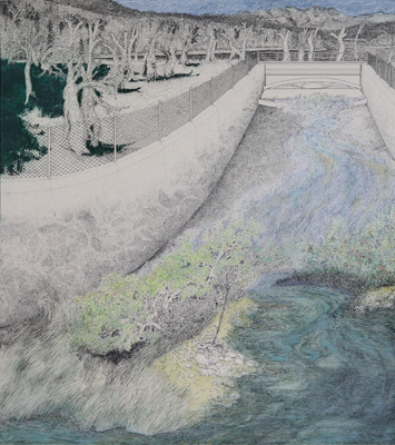 Sunken Garden with Reflecting Pool is part of artist Judith Poxson Fawkes' series of linen tapestries that depict high-contrast, three-dimensional scenes. The imagery was inspired by classical architecture, such as steps, columns, pools, and arches. Poxson Fawkes noted "my art work comes out of my attraction to fantasy landscape and my delight in the challenge of creating a beautiful and meaningful composition that will not only capture the viewer's eye but move it along the tapestry."