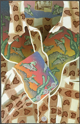 Poxson Fawkes' tapestry artworks highlight the figurative possibilities of loom weaving. She designed her compositions using gridded drawings on graph paper. She often used a bird's eye viewpoint and played with the illusion of three-dimensional space on a flat surface by showing multiple sides and shadows of objects.