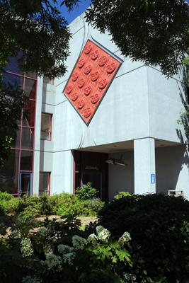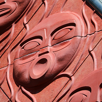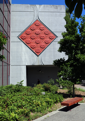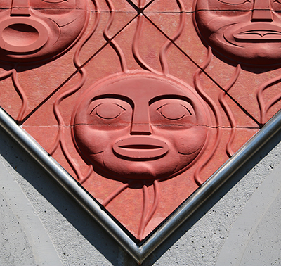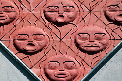 Four Corners is a large-scale wall mural created by Musqueam artist Susan Point as a site-specific installation at North Seattle College. The mural depicts human faces and water running through the background. They are executed in an Indigenous Coast Salish artistic style as tribute to the Indigenous communities that lived in the area and the "new diverse ethnic population of the college and the surrounding community." The artist notes that the faces "symbolically represent all ethnic backgrounds or races of people from all 'four corners' of the planet as well as paying tribute to the peoples of the past, present and future...The water in the background represent the springs and wetlands of this site. The terra cotta color represents the clay found in these springs. This red clay was used by the first peoples for paint, pottery and spiritual ceremony."