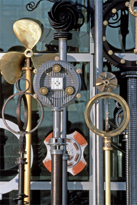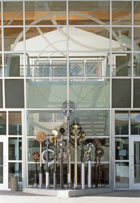 Part one of artist Karen Guzak's five-part installation at South Seattle College, 'Tech Totem Garden' was fabricated with help from student welders. This part of the artwork consists of twenty-one pieces, crafted with fine metals salvaged from the technical skills programs at the college. Guzak's five-part installation celebrates technology and the value of work. It is interactive in nature as students will walk through and around the artwork parts, and it is unified by the motif of circles and arcs in the artwork as well as in the students' paths around it.