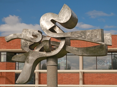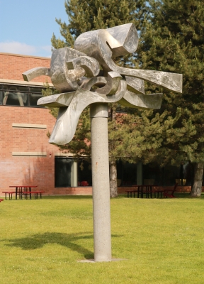 Circle of Friends is comprised of five sculptures created by artist Harold Balazs. Each piece features exuberant abstract forms composed from a different type of metal. This one is made of stainless steel. The sculptures are placed in Mt. Spokane High School's courtyard, encouraging friendly gatherings within the space.