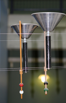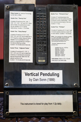 Vertical Penduling with Patty Quake is an interactive electronic and mechanical sound sculpture created by artist Dan Senn. Four compact disc (CD) players play musical scores consisting of sub-audio pulses. The pulses control sixteen pine-wood beaters suspended on nylon lines, which strike bells and piano wire to create musical sounds. Viewers can select one of five musical scores that range in duration from fourteen minutes to one hour.