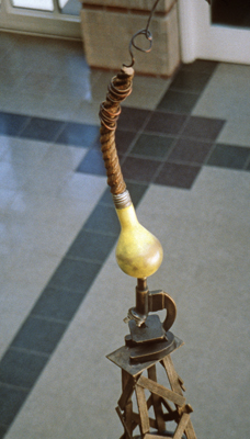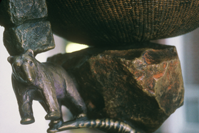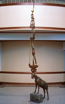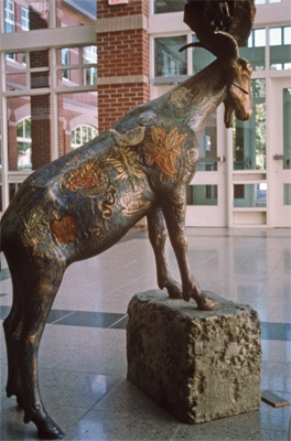 Artist Brad Rude's cast bronze sculpture The Discoverer shows a single goat balancing a tower of objects on its head. The surface of the goat and the objects represent education in a variety of ways: such as a lightbulb, woolly mammoth, telescope, paintbrush, brick, amphora jug, apple, and more. Rude notes, "I portray animals in situations that mimic our own lives. The animals are a stand in for us."