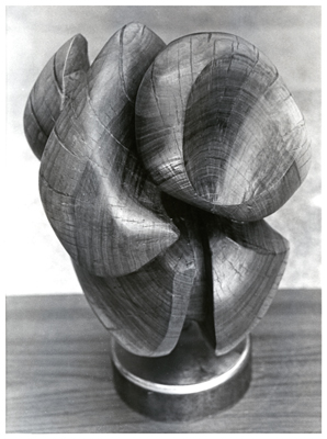 Apricot is an abstract sculpture by artist Morse Clary. Its title references the type of wood it was carved from. The composition is reminiscent of organic forms, and highlights the rich texture and color variations in the wood grain.