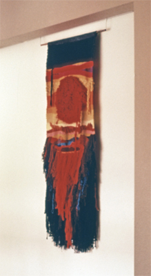 Red Planet Number 1 is an abstract tapestry created by artist Ilse Kilian-Tan. The design features a textured circle of red strands of wool, protruding from a landscape-like background. The bottom half of the piece consists of long, hanging strands of wool, which are dyed various shades of red.