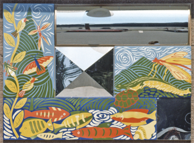 This piece is one of two panels by artist Ford Crull that feature brightly colored and intricately detailed abstract figures. These works imaginatively investigate negative space while energetically asking the viewer to interpret the interaction of forms.