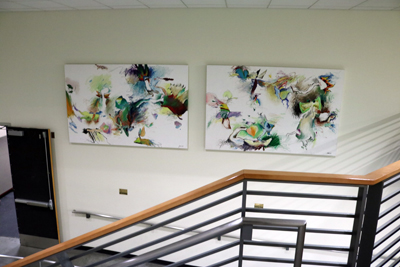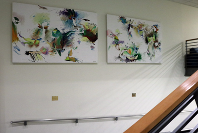 This piece is one of two panels by artist Ford Crull that feature brightly colored and intricately detailed abstract figures. These works imaginatively investigate negative space while energetically asking the viewer to interpret the interaction of forms.