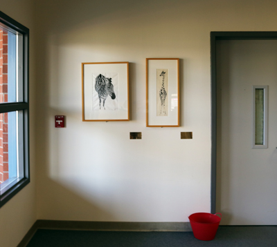 Giraffe is a figurative print created by artist Joel Hust. He created the composition by cutting the negative space out of a linoleum block. He then layered ink onto the areas of linoleum that remained and transferred the image to paper.
