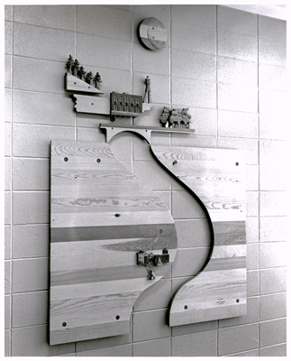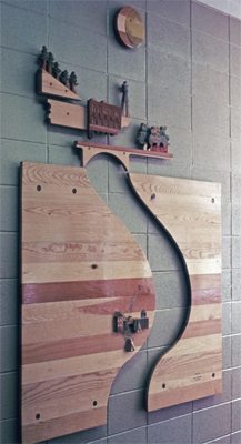 Nine Mile is a wood sculpture created by artist Brian Henderson for Nine Mile Falls Elementary. Using stylized imagery, he captures the landscape of Nine Mile Falls. He uses negative space to imply the Spokane River.