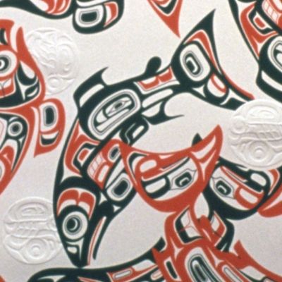 Native American artist and master carver Marvin Oliver's (Quinault/Isleta) print New Generations features an active combination of formline salmon figures and embossed forms representing salmon eggs. As a Native American artist working in the Northwest Coast tradition, this artwork represents Oliver's connection with the traditions of his people's ancestors, the salmon, and his hope for future generations.