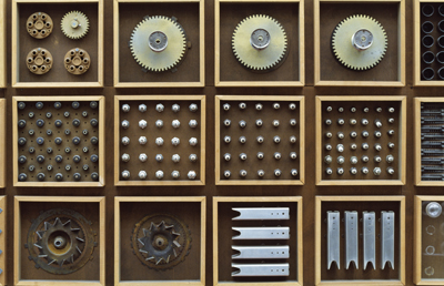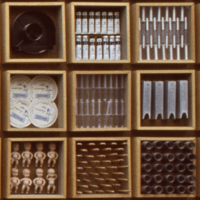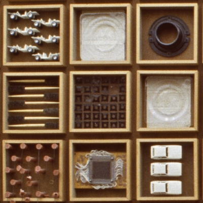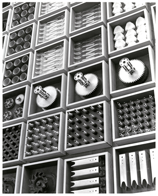 Artist Gloria Crouse filled 200 frames with objects collected from Clover Park Technical College's vocational training programs. Crouse is best known for her textile works, and after discovering the tactile nature of rug hooking, began using more rigid materials which eventually lead to a career in mixed media sculpture.