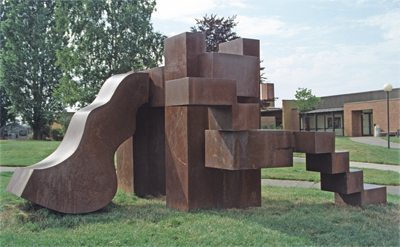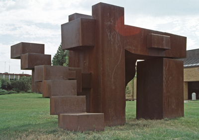 Gate II is a large-scale steel sculpture by Northwest artist Lee Kelly. The geometric relationships of this whimsical structure reference architectural, organic, and elemental forms. This piece is a compelling early example of the artist's body of monumental public sculptures.
