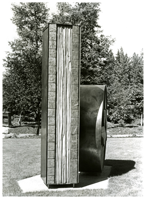 Artist David Gallagher was commissioned to create Segmental Sculpture in the first years of Washington's Art in Public Places Program. As a whole, the sculpture presents a dynamic interaction between materials, textures, and forms. Gallagher constructed the disk and column elements in sections. He first cut the cedar into pieces, joined them together, and shaped them with different carving tools. He then rolled the bronze onto each element.