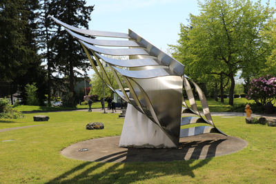 This striking steel sculpture, titled Poktalaruk 'huk shuk, investigates balance, line and material. It also references Beck's Native Alaskan heritage. Seeming to suggest whale bones, it is a fixture of the Highline College campus.