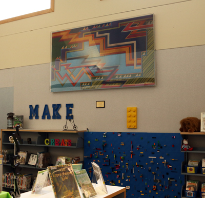 Artist Carol Tate created this brightly colored quilt for Cottonwood Elementary. The energetic, abstract composition uses lines and repetition to suggest a landscape filled with dynamic elements.